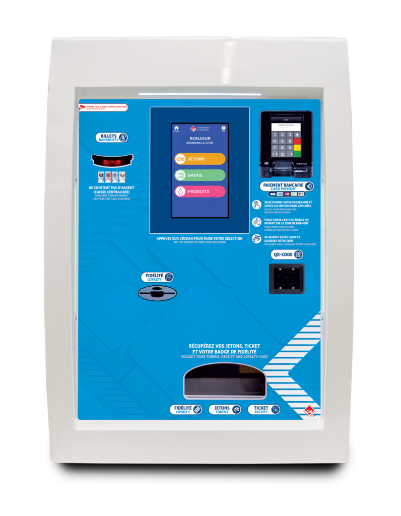 Équipé d’un écran LCD 8” avec boutons ou d’un écran tactile 8”, ce distributeur combine facilité d’utilisation et compatibilité avec toutes les options du catalogue. Il peut accueillir jusqu’à 3 trémies pour jetons, monnaie ou cartes/clés de lavage rechargeables.