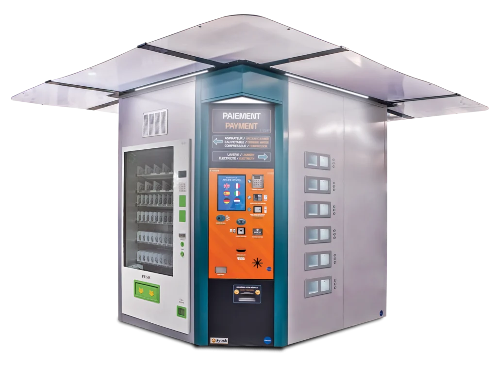 À partir des équipements traditionnels comme le souffleur d’aspirateur ou le gonfleur, vous pouvez ajouter de nouveaux services en option : distributeur de produits en spirale, machine à café, mini laverie, etc.